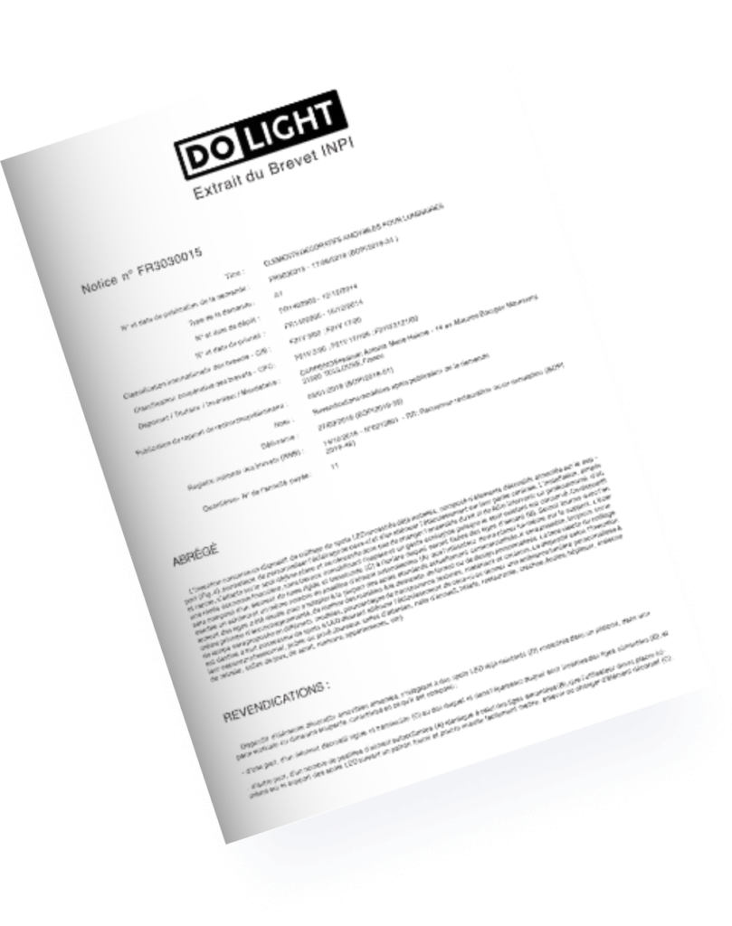 Le brevet protège toute fixation magnétique d’un dispositif de coiffage sur une source lumineuse. Pour en savoir sur notre innovation, téléchargez un extrait du brevet au format PDF ou visualisez-le directement sur le site de l’INPI en cliquant sur les liens ci-dessous :